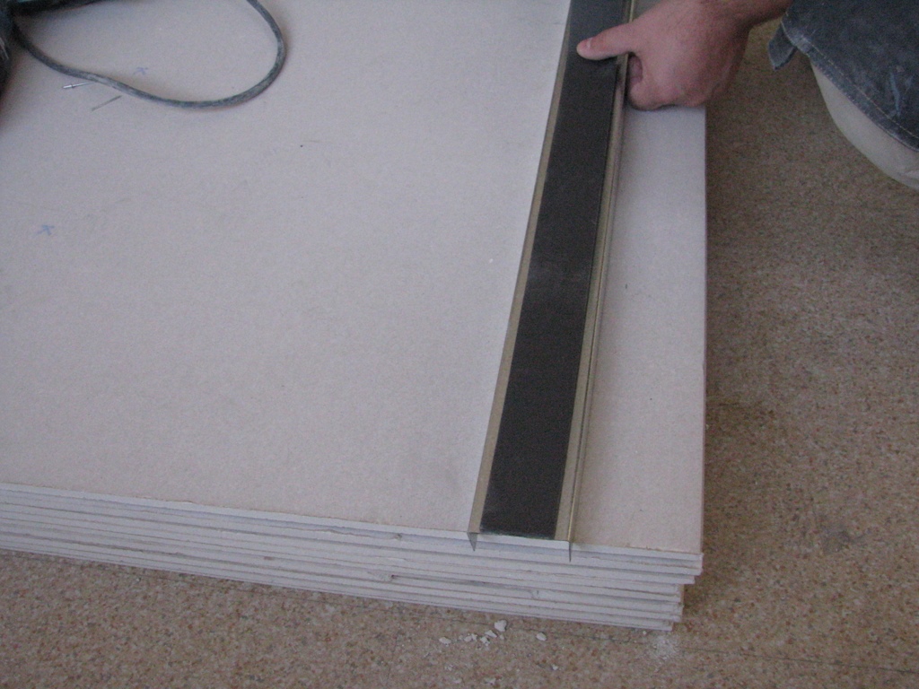 Обшивка каркаса начинается снизу с отступом от пола 1 см. Исходя из стандартной длины листа 250 см и высоты потолка, а также с учетом зазора между нижним торцом и полом, необходимо рассчитать высоту необходимого отрезка ГКЛ под потолком. По технологии монтажа перегородок из гипсокартона КНАУФ не допускается применять отрезки короче 40 см, поэтому если в результате расчета этот размер оказался меньше, то начинать монтаж нужно с половины листа. Все горизонтальные торцы обрабатываются специальным кромочным рубанком, с углом снятия фаски 22,5° на глубину 1/3 толщины. Для установки нижнего листа нужно подготовить подкладки толщиной 1 см, чтобы выдержать соответствующее расстояние от пола.