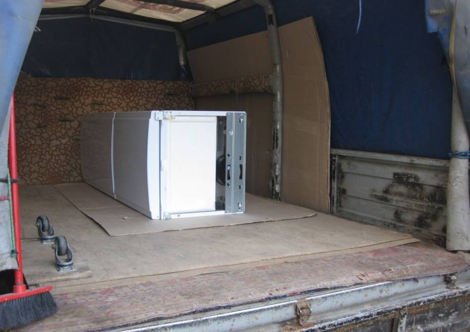 Оптимальный вариант – вертикальное положение, при этом борта грузовой машины должны быть вровень с высотой агрегата. Но, если такой возможности нет или холодильник перевозится в прицепе, его нужно крепко фиксировать к каркасу грузового кузова.