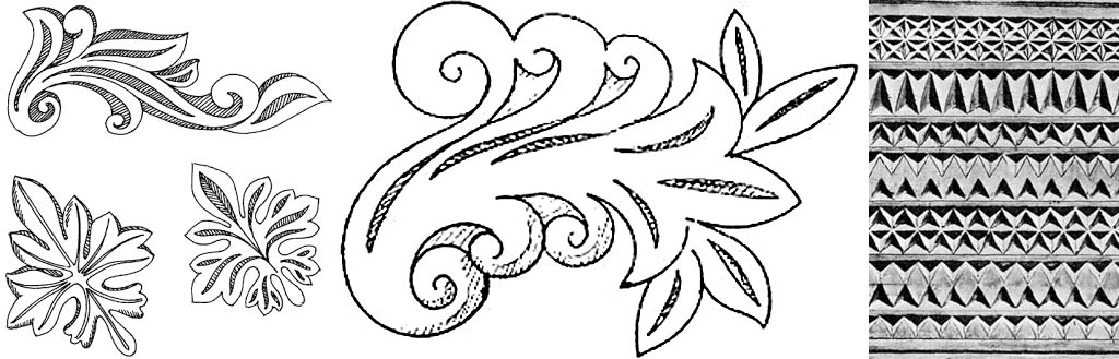 Когда вы закончили с приданием формы, было бы неплохо разнообразить оставшиеся плоские элементы простым орнаментом или растительными узорами. Вот простейшие приёмы работы: