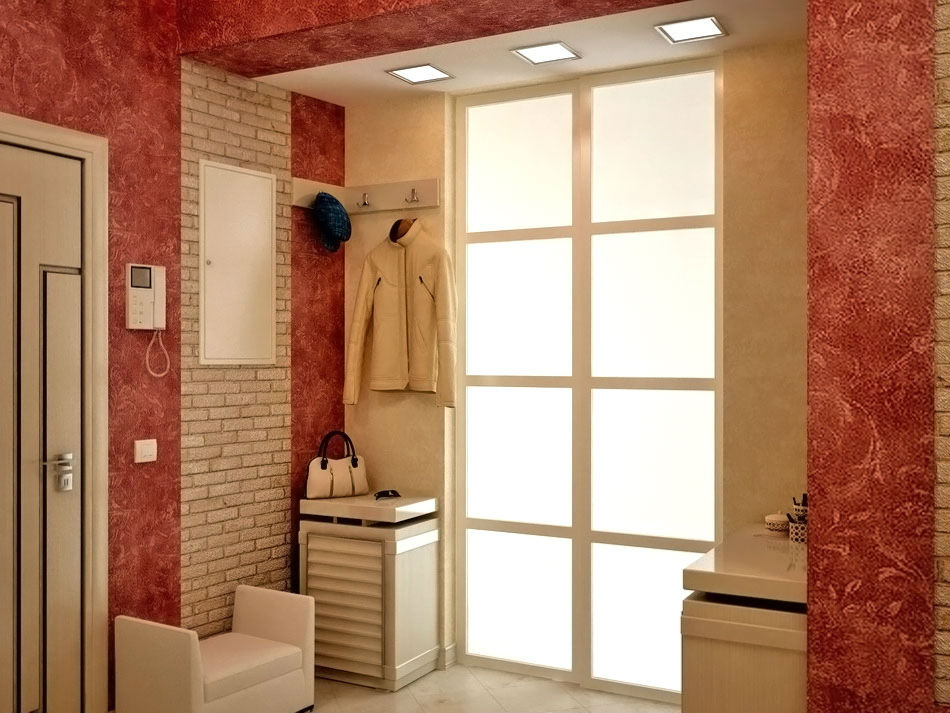 Фото-пример, отделка стен в прихожей декоративной штукатуркой, бесшовная облицовка прекрасно сочетается с другими материалами