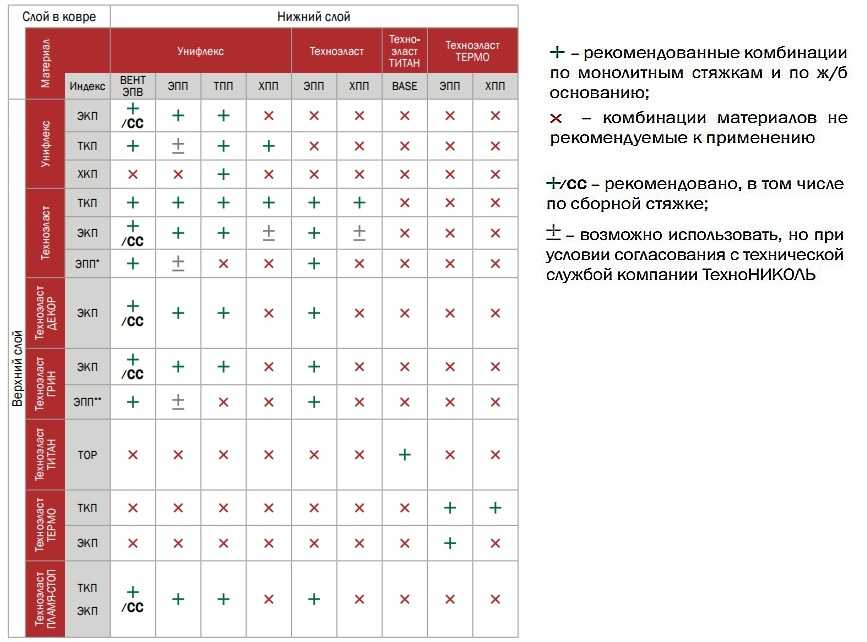 Все дело в совместимости качеств и характеристик, потому желательно на кровле использовать все элементы одного производителя. У солидных кампаний даже есть специальные таблицы, по которым можно подобрать требуемый пирог. Один из самых известных в России производителей — фирма Технониколь, их таблица и приведена ниже.