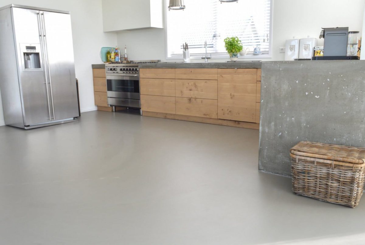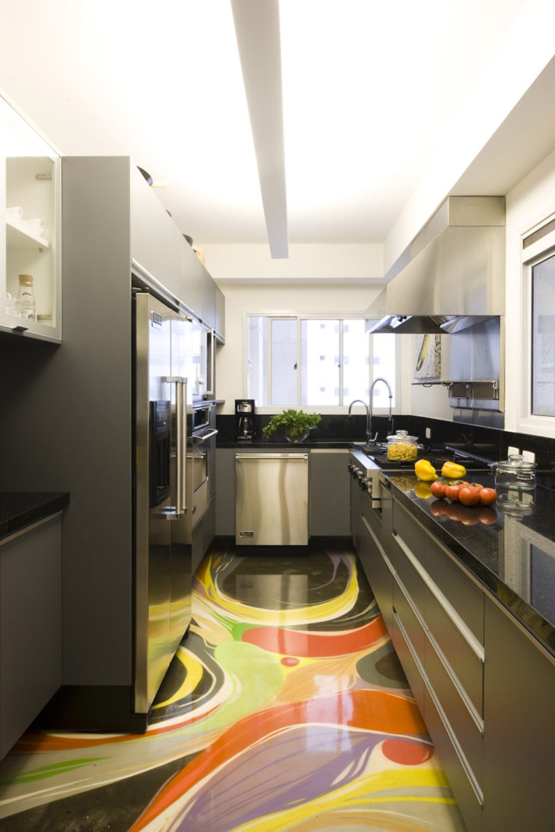 Пол на кухне можно не выкладывать, а заливать. В этом и состоит основное отличие данного вида покрытия. Основанием служат бетон или дерево. Толщина варьируется от 1 до 7 мм.
