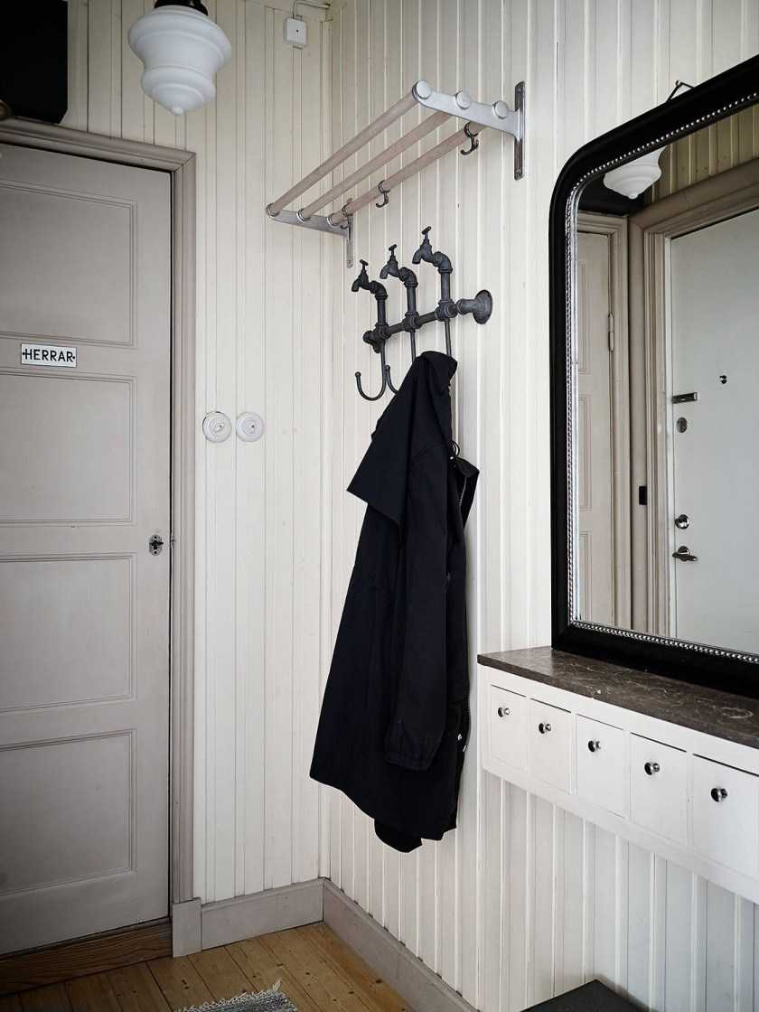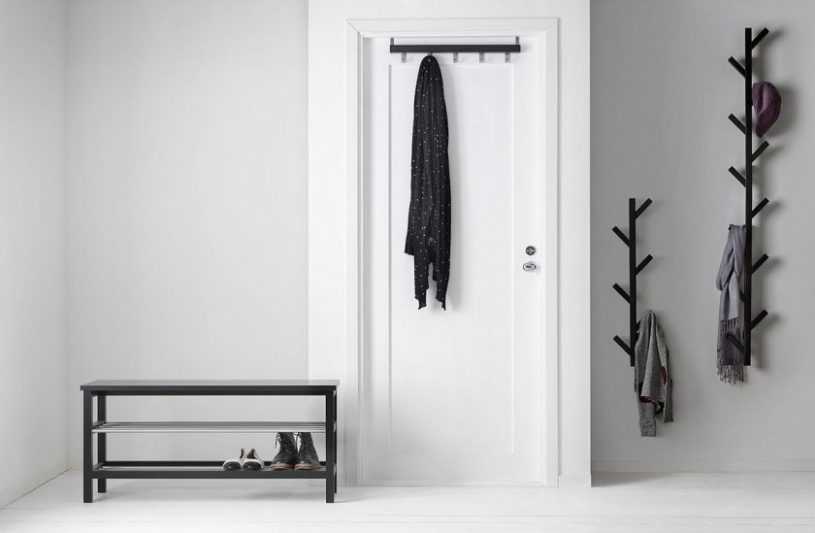 Более простым, но не менее стильным решением станут крючки для одежды, прикрепленные к одной планке
