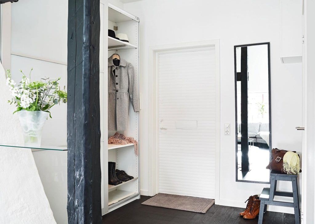 - идеально место для зеркала в прихожую – две оставшиеся стены. На одну повесьте его, напротив – картину с цветами, банкноту, фотографии счастливых моментов из жизни семьи;