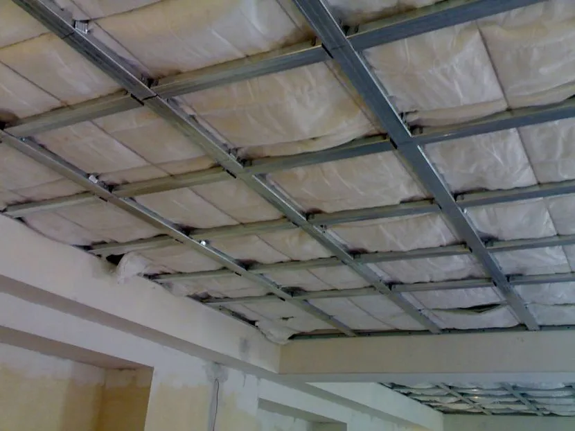 - Если используется массивная шумоизоляция потолка, монтируют усиленный каркас (в виде сетки).
