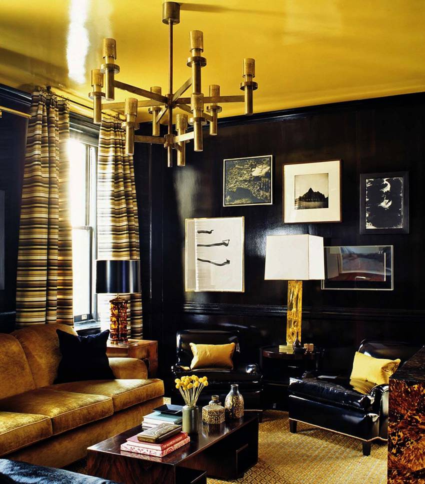 Радикальное решение — чёрные потолки. Их лучше сделать глянцевыми, чтобы поверхность не нависала над головой. В этом цвете отражающий эффект будет выражен сильнее всего. Остальную обстановку делают светлой, чтобы гостиная не стала слишком мрачной.