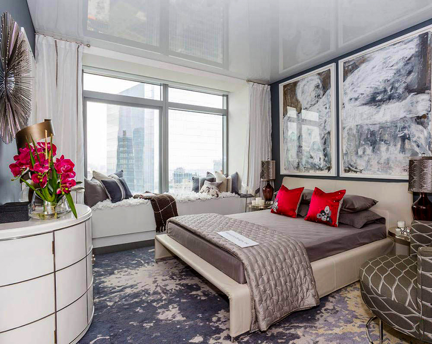 Здесь, как и в зале, можно использовать любые виды материала, но с фактурой необходимо обращаться очень осторожно. Не всем понравится наблюдать на потолке все, что происходит в кровати, плюс блики уличного света