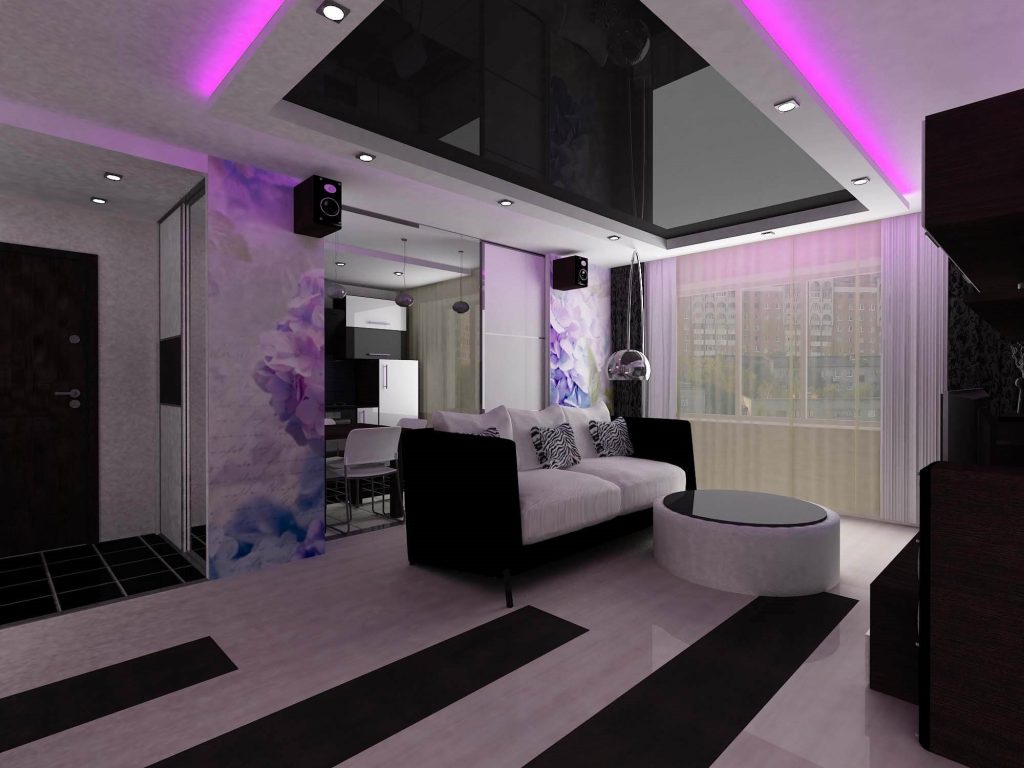 Лучше всего для гостиной подходят многоуровневые конструкции, они придают потолку особую оригинальность. Но такое решение стоит выбирать только для высоких помещений достаточно большой площади. Если размер комнаты маленький, а высота потолка небольшая, лучше использовать одноуровневую конструкцию с глянцевым полотном, чтобы зрительно приподнять поверхность.