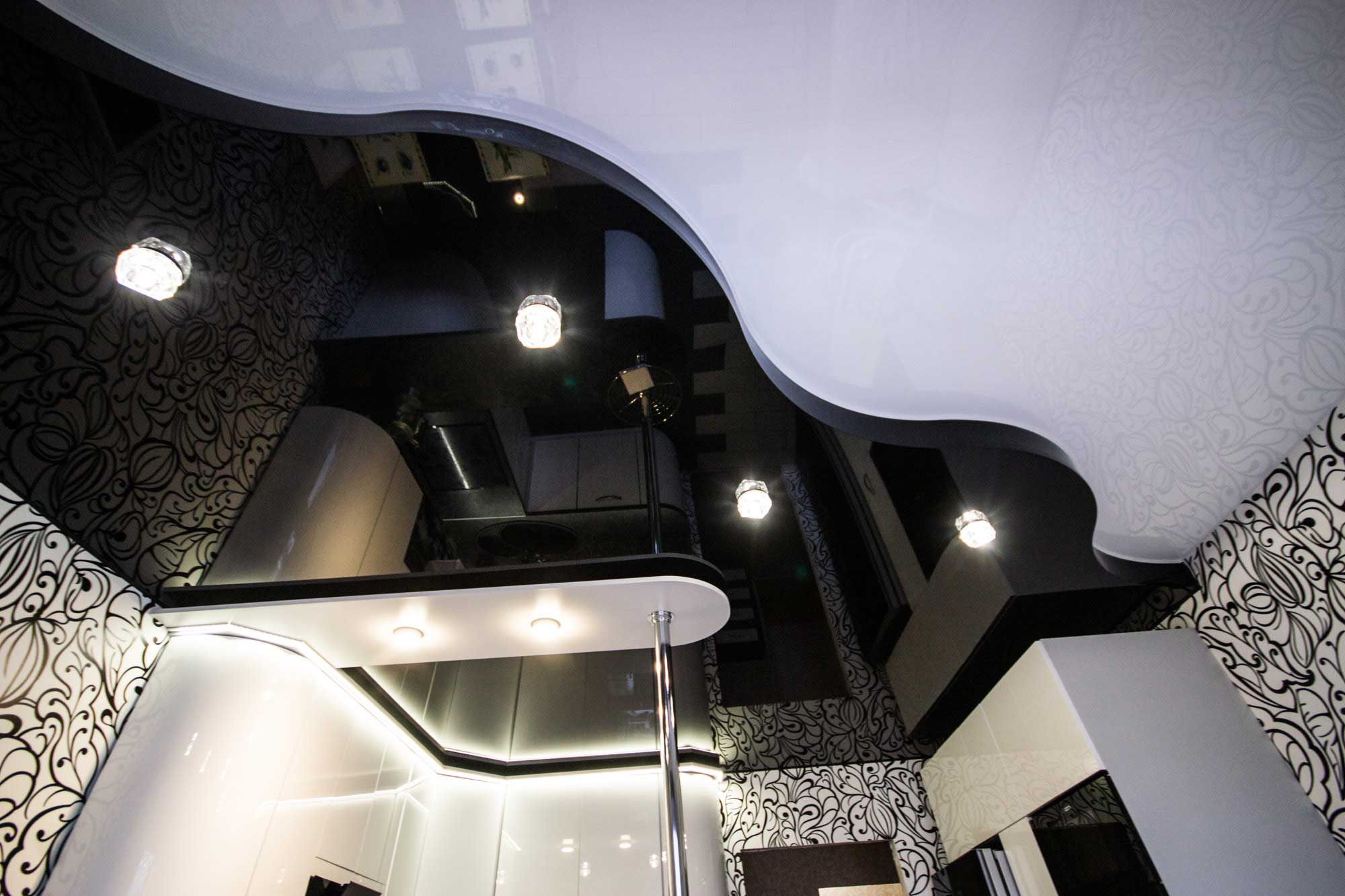 Наиболее эффектны многоуровневые натяжные потолки с фигурными элементами. Установленные по их кромке светильники создают оазисы света, формируя атмосферу торжественности и респектабельности. Для устройства таких потолков подойдут любые полотна: тканевые и ПВХ. Выбор цвета и фактуры зависит от стилевого решения интерьера помещения.