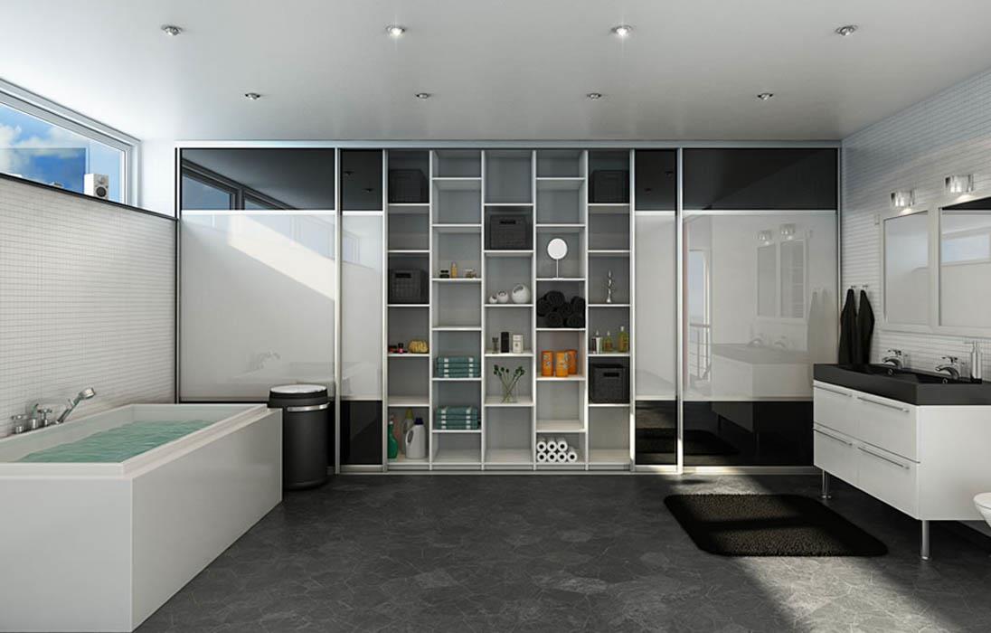 Такой вариант отлично подходит для маленьких помещений, так как визуально придает ему больше пространства. Пожалуй, единственным минусом является то, что все содержимое не скрыто от посторонних глаз. Но этого также можно избежать, если приобрести модели из матового или тонированного стекла.