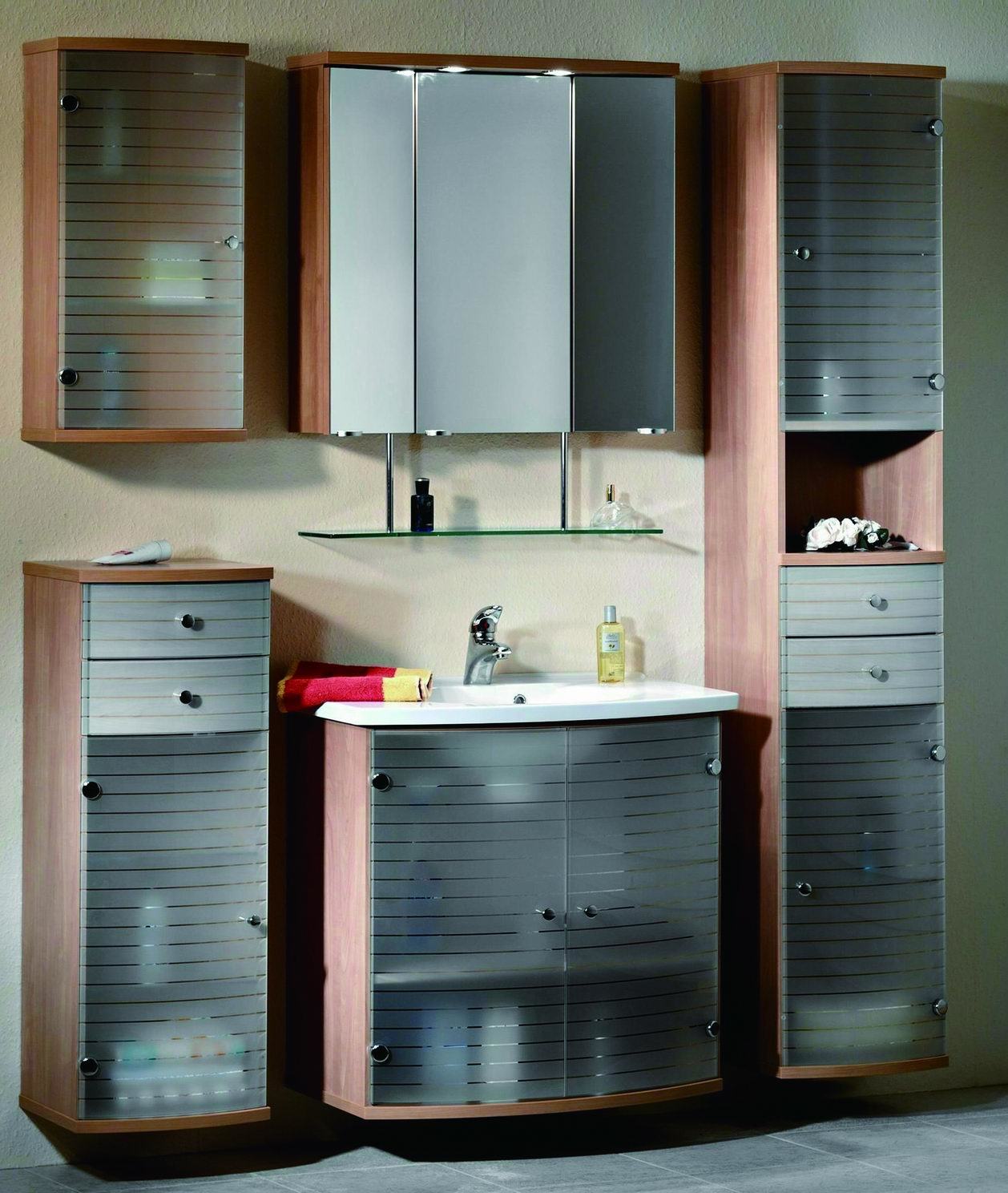 Этот материал хорошо переносит высокую влажность. Шкафчики, изготовленные из закаленного стекла, являются очень прочными. Они имеют закругленные углы, что способствует уменьшению травматизма.