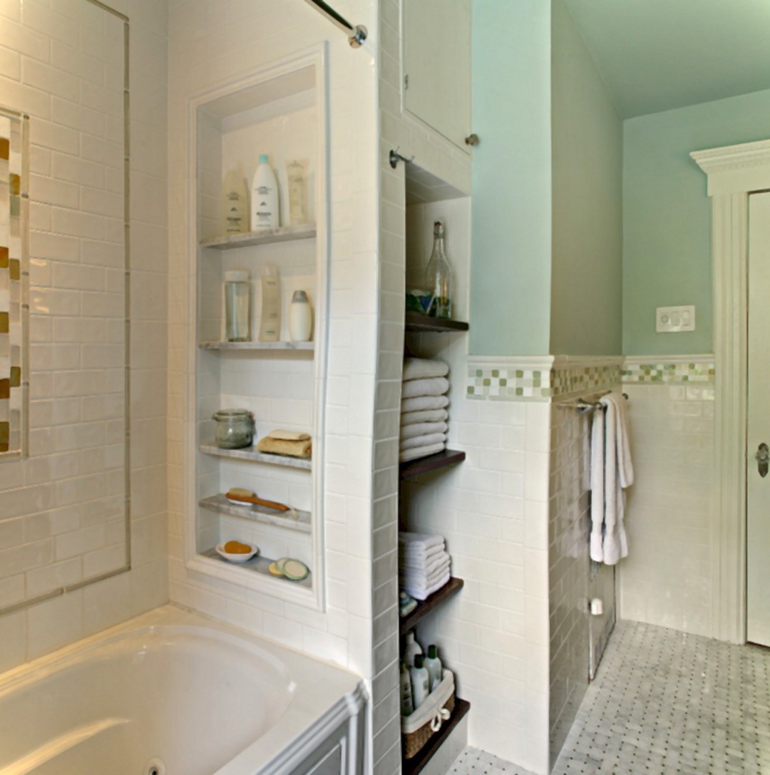 Навесные шкафчики могут быть маленькими, иметь глубину до 15 см. Такой вариант, конечно же, не является особо вместительным, но отлично подходит для необходимых гигиенических средств каждодневного использования.