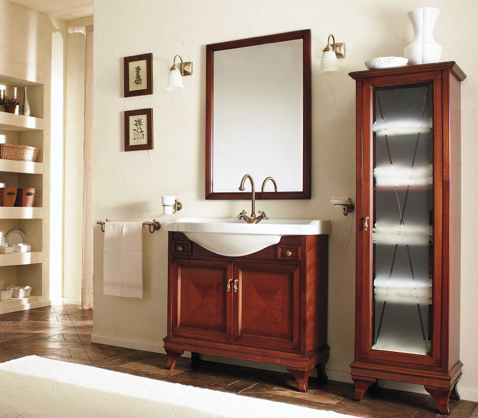 Крепкая, из материалов, устойчивых к химическим «казусам». Все, что нужно спрятать от посторонних глаз окажется за дверцами ванных шкафов, в том числе бытовая химия, порой весьма агрессивная и способная упасть и разлиться\рассыпаться. На хорошей мебели не должно оставаться «химических ожогов».