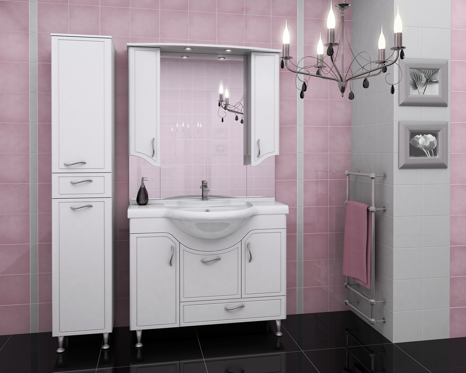 Ну и конечно, насколько просто вам будет ухаживать за поверхностями мебели: достаточно ли они гладкие или там есть детали, которые будут накапливать грязь, влагу, создавать возможность образования плесени? Можете ли вы вовремя и качественно все это убирать? Если да — то вперед, пусть шкафы в ванной будут красивые: в сложных стразиках и глубоких рисунках)