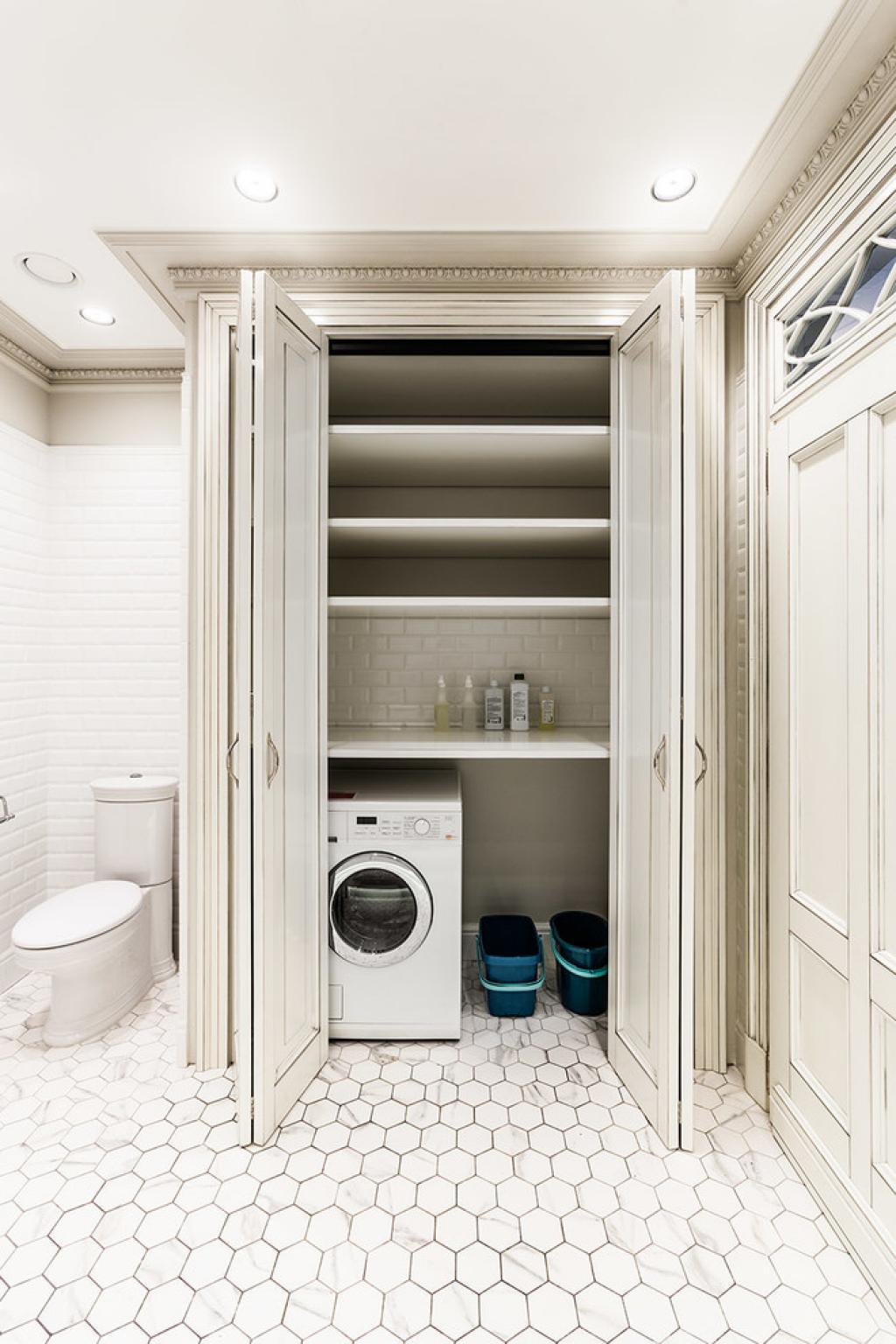 Для порошка и полотенец предусмотрены специальные полки