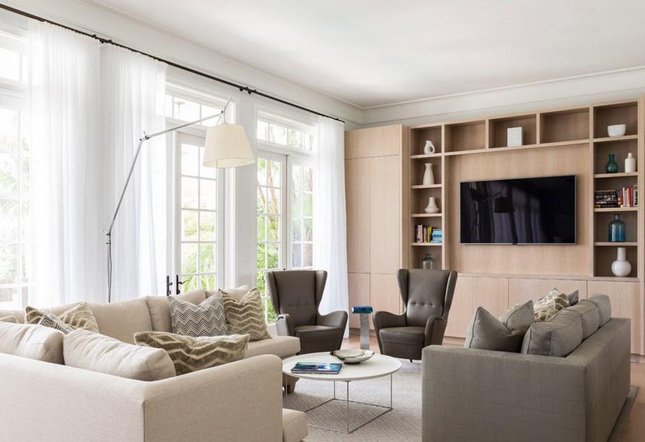Именно на эту зону будет направлено все внимание. Напротив телевизора нужно будет поставить большой диван и кресла, журнальный столик