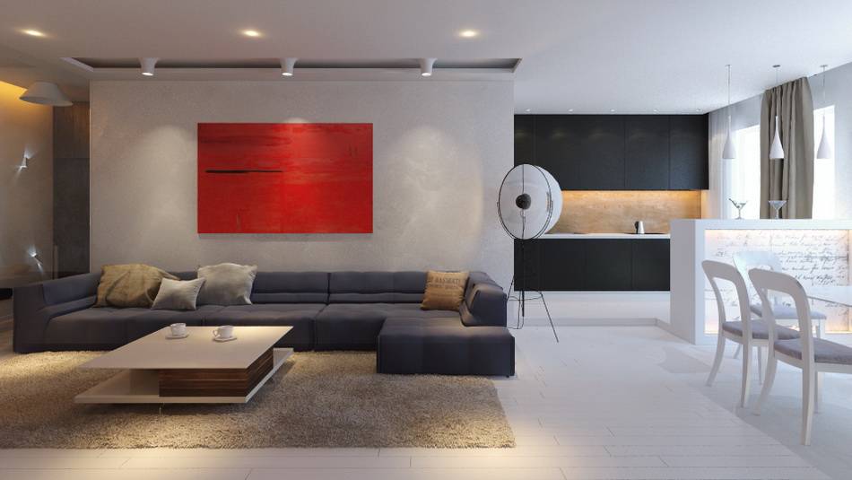 - Красный — признан в интерьере самым «агрессивным» цветом. Алый и близкие к нему оттенки хорошо войдут в гостиную планировки студия.