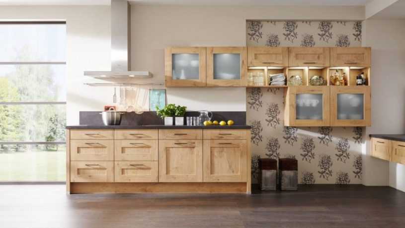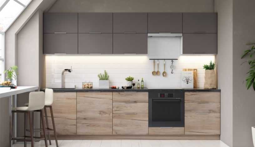 Готовые кухонные шкафы Леруа Мерлен предъявлены разнообразными вариантами, как угловыми, так и на одну стену. Их изготавливают из следующих материалов: ламинированный ДСП, пластик и натуральное дерево. Для покрытия поверхности мебельных панелей используется плёнка из акрила.