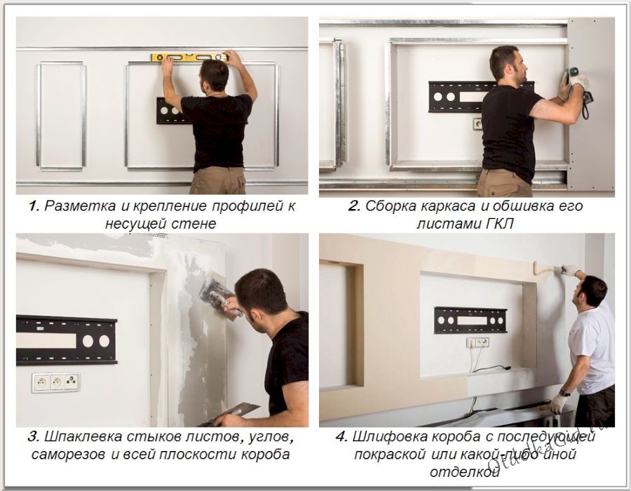 Естественно, процесс включает намного больше нюансов и правил. Чтобы избежать ошибок, необходимо ознакомиться с подробной технологией в статье: «Как сделать нишу из гипсокартона».