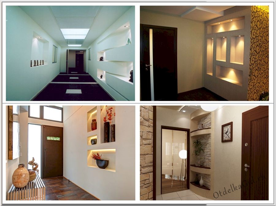 - В коридоре можно выполнить ниши на одной линии. Конфигурация подбирается индивидуально, но более предпочтительны квадрат, прямоугольник и овал.