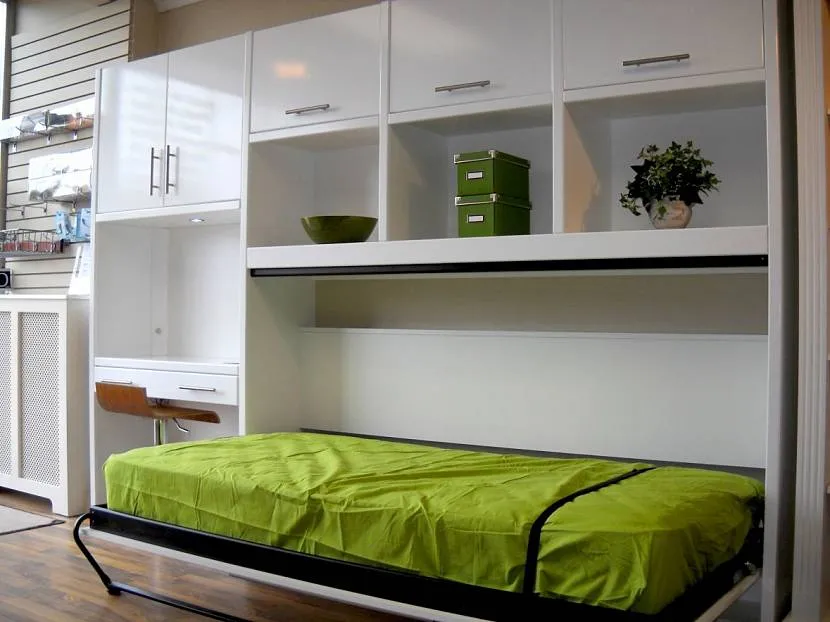 Чтобы максимально разгрузить помещение, нужно использовать откидную кровать горизонтального или вертикального типа. Из-за того что наружная сторона изделия сочетается по цвету с отделкой шкафа, в собранном виде модель сливается с окружающей поверхностью.