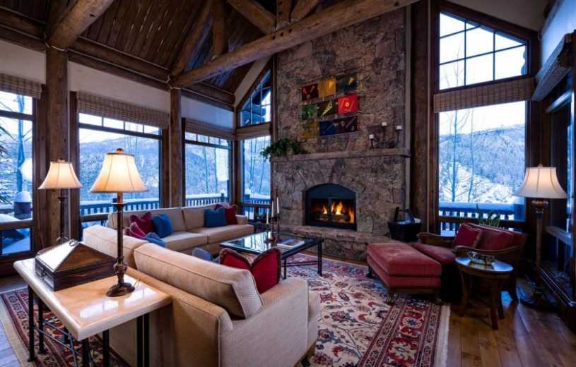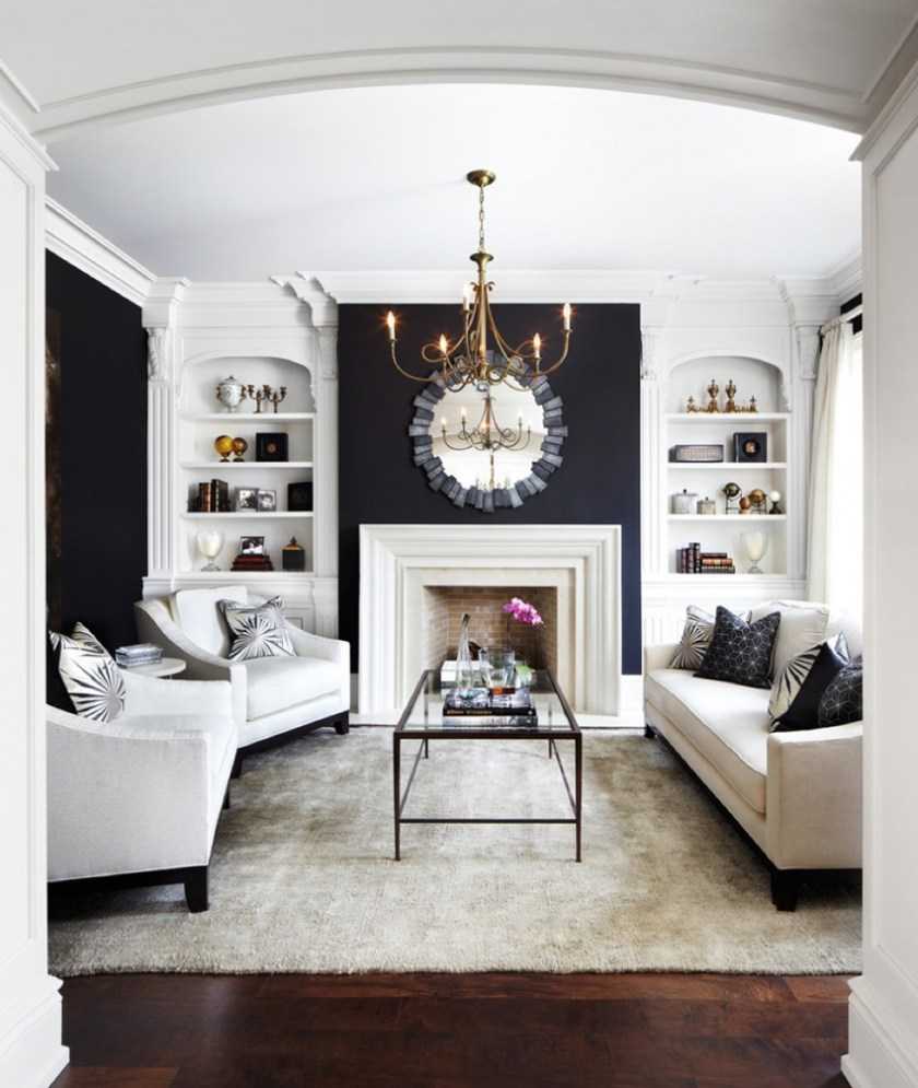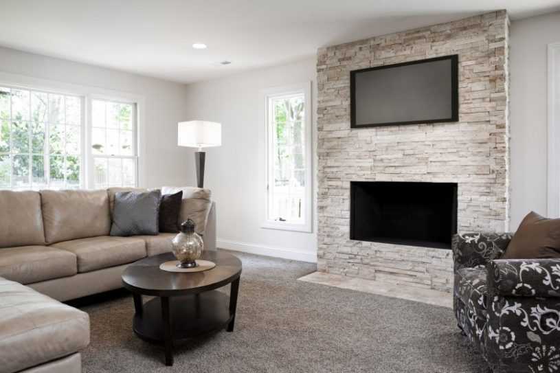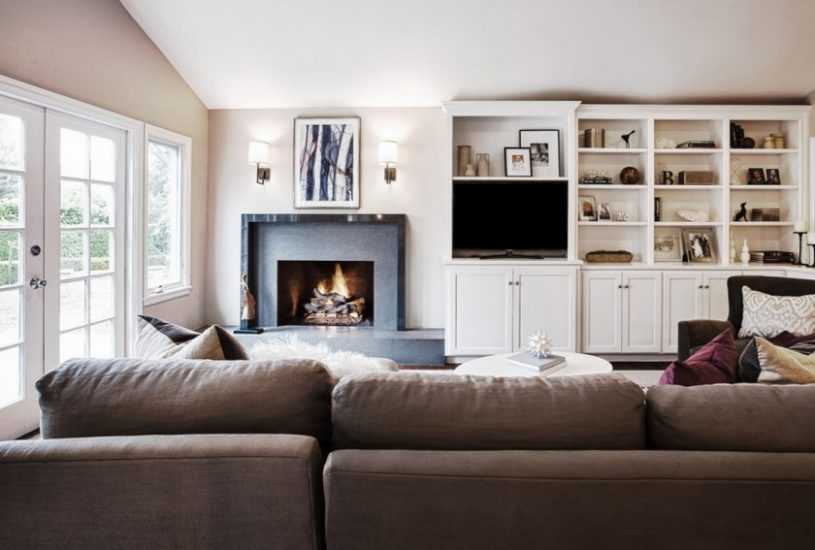 Располагая предметы мебельного гарнитура в гостиной с камином в современном стиле, следует учесть, что посадочные места должны быть обращены фасадом к пламени.