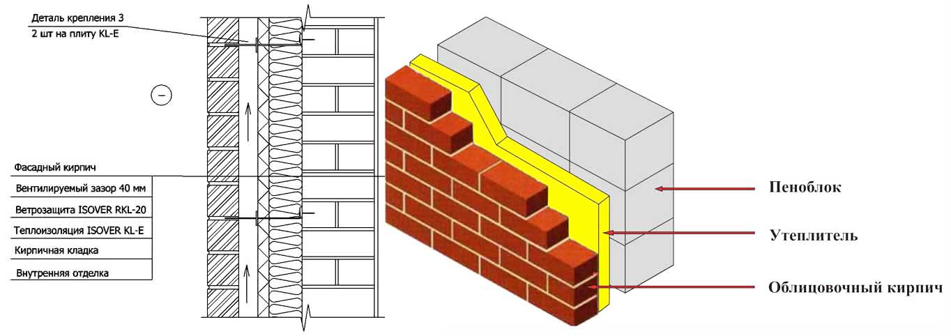 Этот способ облицовки наиболее рациональный с точки зрения технических характеристик материалов и долговечности строения. Однако возведение подобной конструкции должно производиться по определённым правилам (СП 23-101-2004 пункт 8.14).