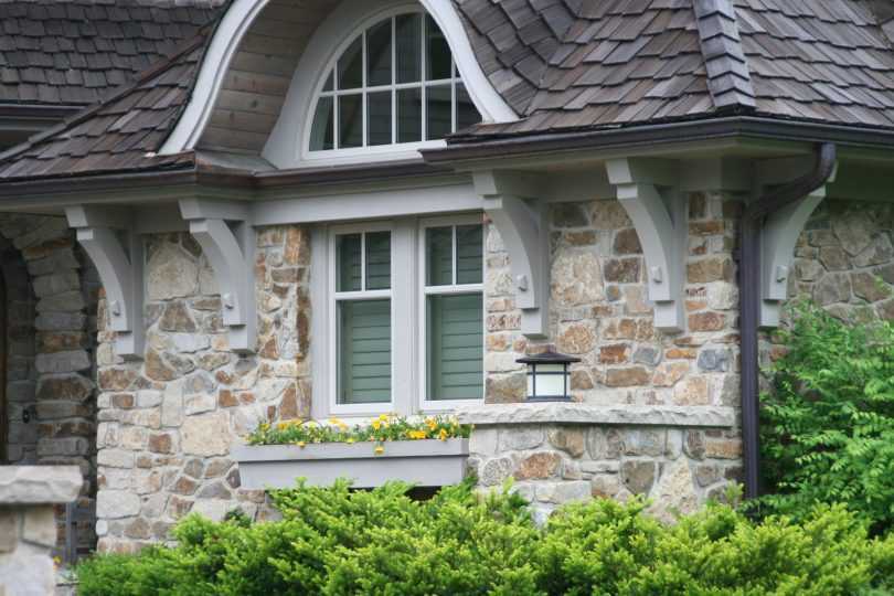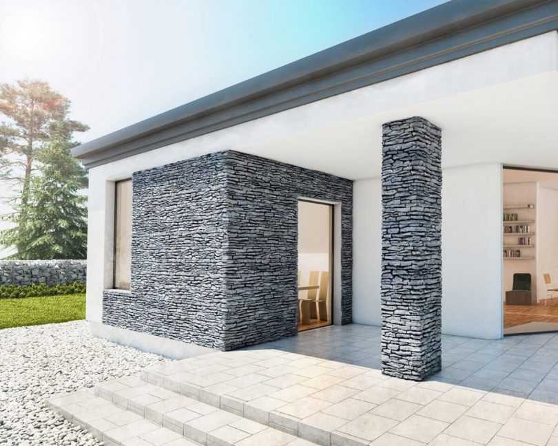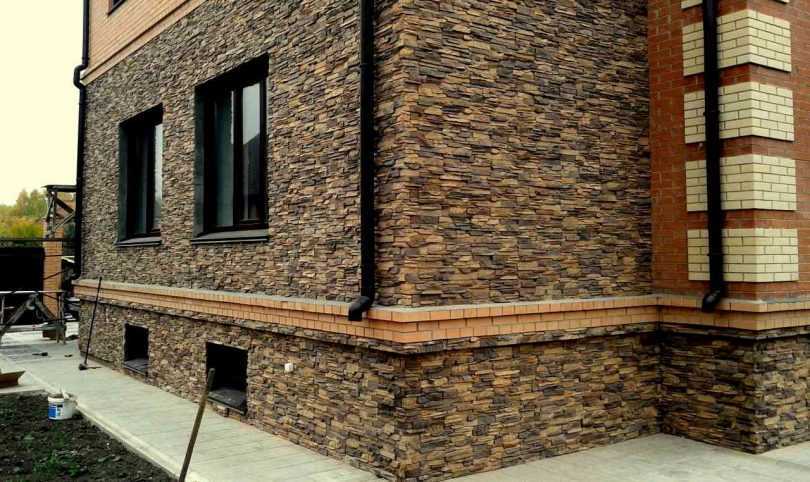 Камень для внешней отделки фасада может быть искусственного происхождения. Он выглядит аналогично натуральному «собрату», но стоит дешевле. При этом зрительно найти отличия фактически невозможно.