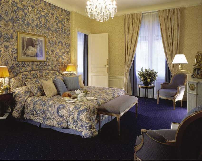 Классические обои с крупным узором и особенно с золотым и серебряным цветом в основании выглядят дорого. Остальная обстановка спальни должна соответствовать, иначе диссонанс и негармоничный внешний вид. Фото когда это правило не соблюдено: