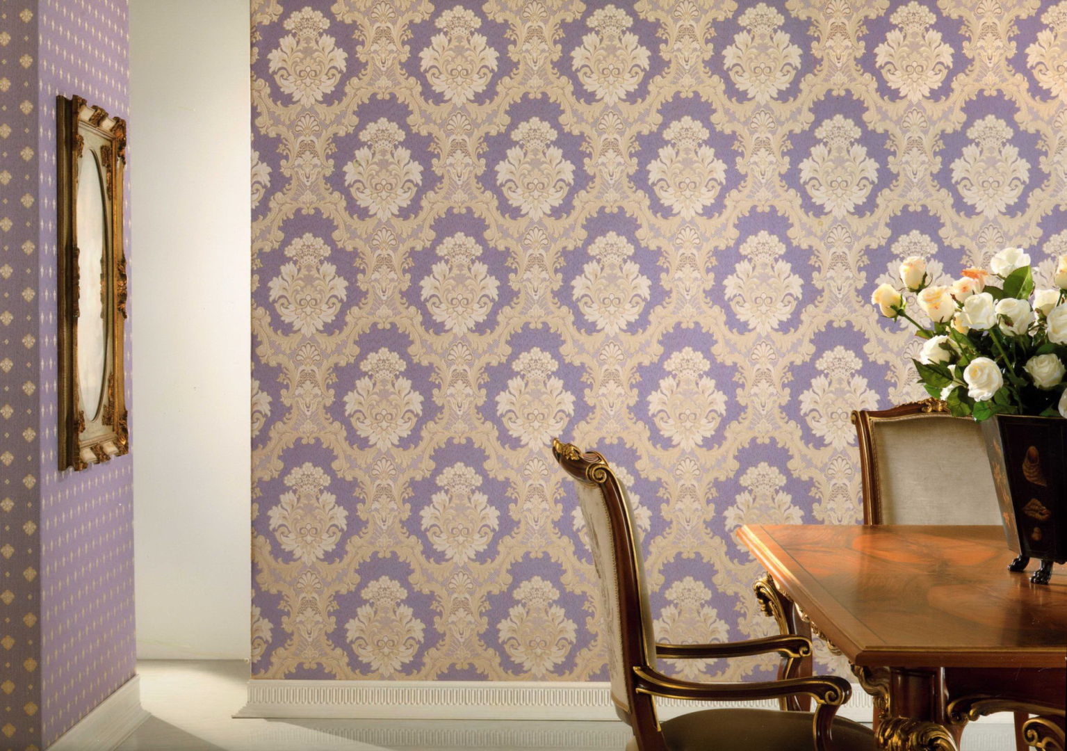 Полотна с большими изображениями – это шедевры для больших просторных помещений или акцентных зон. Ведь нужно пространство, чтобы орнамент заиграл и раскрылся, чтобы он мог проявить себя. Покрытия с большим изображением – это лучшее решение для изменения пространственного восприятия комнаты, создания требуемых акцентов и декоров, формирования оригинальных фонов для прочих предметов отделки. Скорее всего, такие полотна станут центральным элементом дизайна и будут сочетаться с более сдержанными материалами. Безусловно, такое покрытие будет доминировать, но во избежание пространственной “перегрузки” им можно оклеить только одну стену в комнате – например, выделить каминную зону, изголовье кровати или обеденный стол.