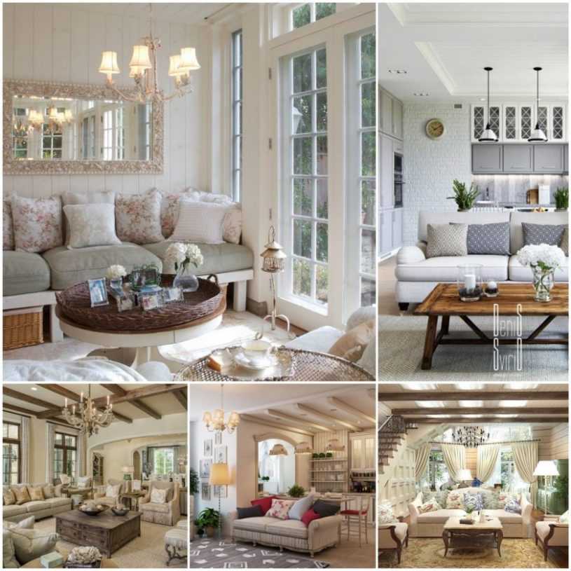 Гостиная в стиле прованс максимально наполнена естественным светом. Большие открытые окна пропускают солнечные лучи и озаряют комнату уютом. Стены отделывают штукатуркой или небрежной кирпичной кладкой, выкрашенной в белый цвет, полы покрывает паркет, камень или беленое дерево. Потолок могут украшать деревянные балки или лепнины.