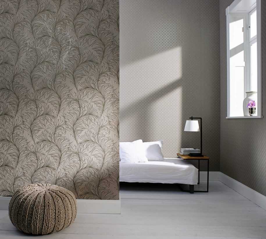 Для декорирования более современных спален можно реализовать другие методики. К примеру, нередко обои с вензелями клеятся на всю стену за кроватью или используются в нише, созданной собственноручно.