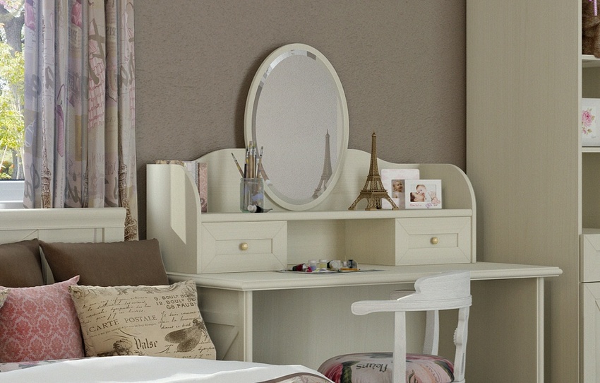 Комплект из туалетного столика, зеркала и мягкого пуфа необходим для представительниц женского пола. Желательно наличие высоких деревянных или металлических ножек, кованых или резных украшений по периметру столешницы и на ящичках.