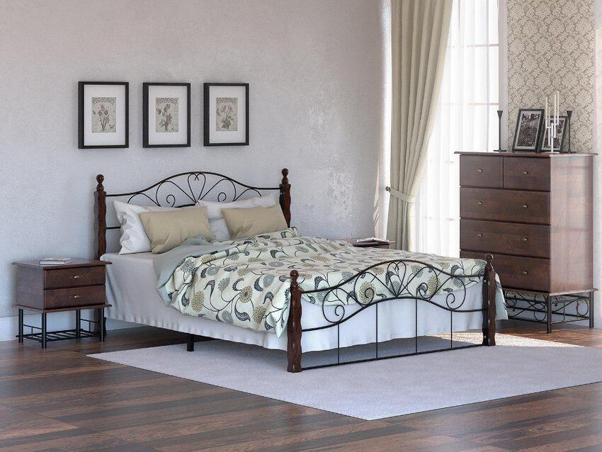 Изящным украшением станет металлическая кровать с коваными элементами на ножках и изголовьем.