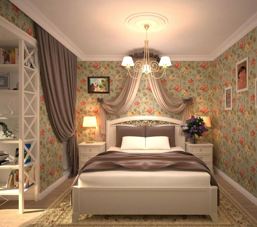 Спальни в хрущевке маленькие, и оформление их в стиле прованс нужно тщательно продумать. Стены можно оклеить обоями с изображением цветов, листьев. Если комната узкая, их лучше просто побелить. Это позволит визуально расширить пространство.