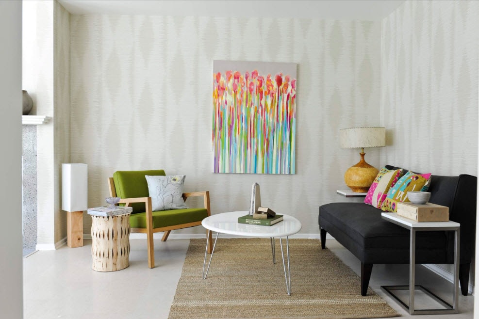 Безусловно запрет на яркие выразительные узоры не возлагается, но нужно понимать, что в компактной гостиной с ними следует действовать очень осторожно. Такого рода принты используйте дозировано, комбинируя с другими поверхностями. Только так можно добиться идеального акцентирующего эффекта