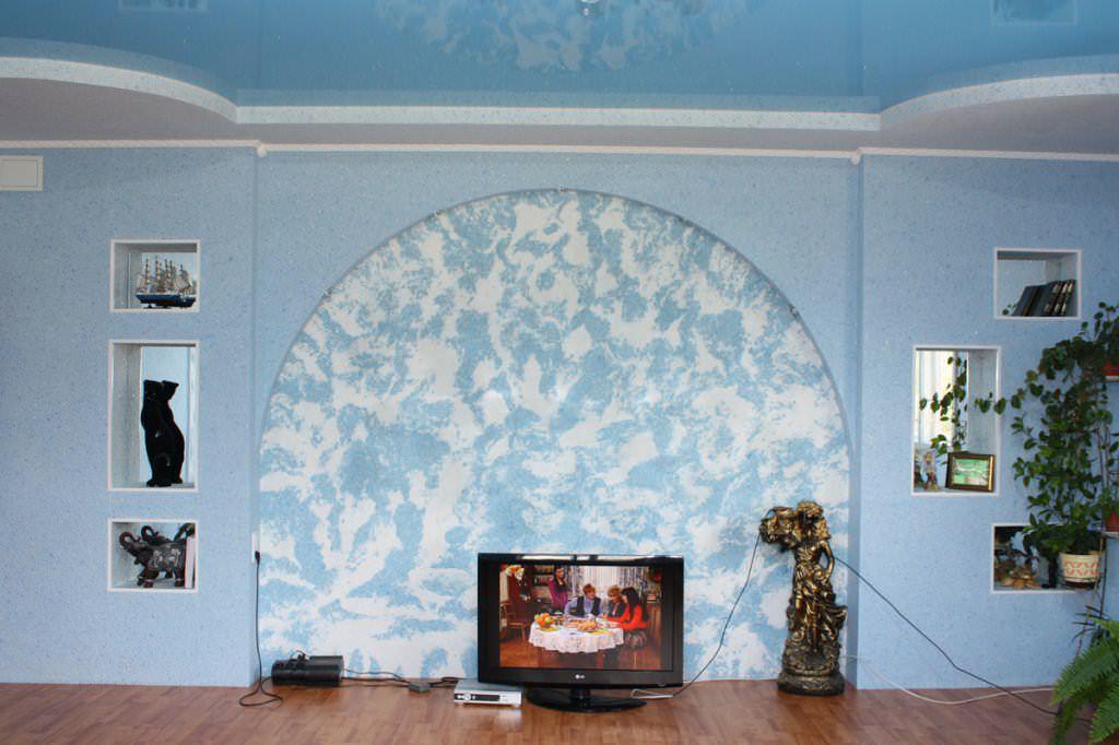 В зале собираются гости и проходят праздники. Украсить стены стильно и сделать комнату презентабельной помогут жидкие обои.