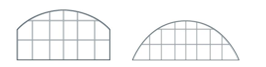 Арочная. Каркас выполняется в виде полукруга, что способствует равномерному распределению влаги внутри конструкции и стеканию конденсата по стенкам теплицы. Для удобства использования такое сооружения делят на сегменты, соединяемые между собой в верхней части.
