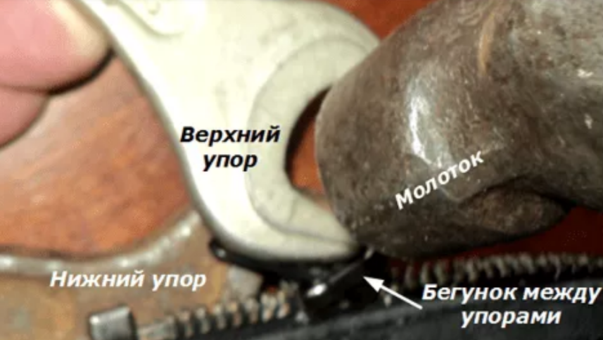Металлическую молнию можно простучать молотком по всей длине несколько раз с двух сторон, это действие уменьшит зазоры. Для этого под молнию положите твердый предмет, например, доску. Чтобы не ударить по средней части бегунка, используется верхний упор. Такой способ хорош для молнии из металла.