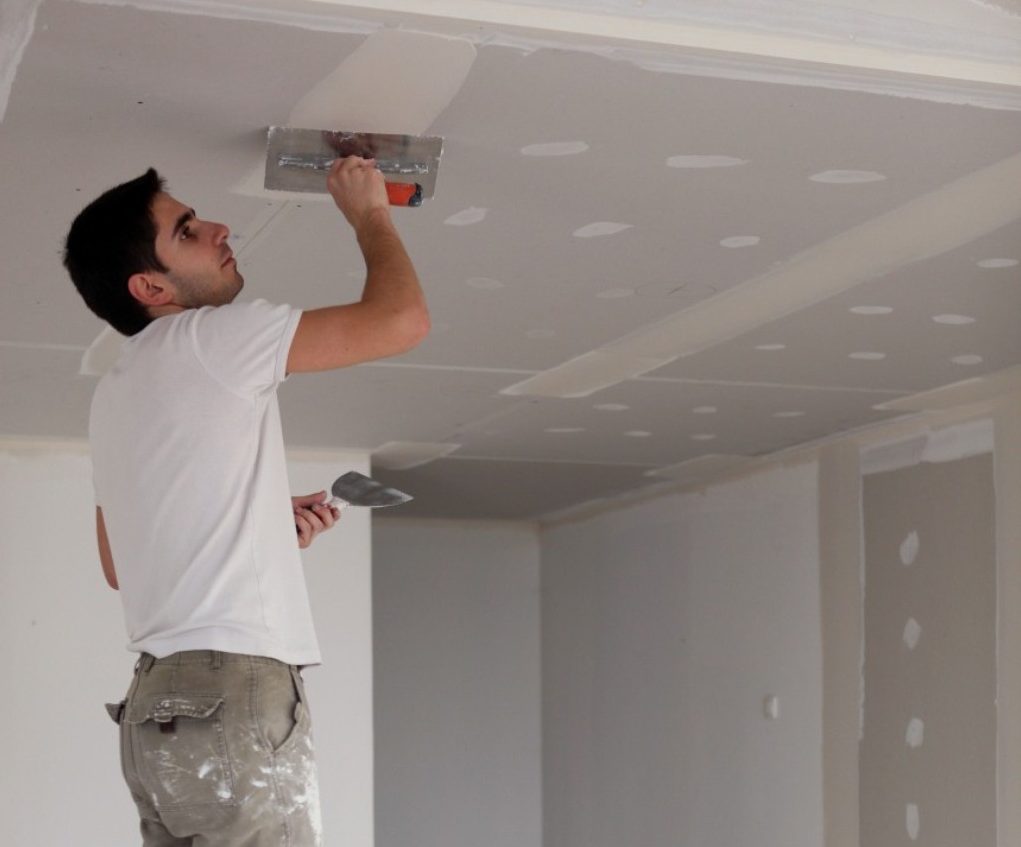 После того как крепление гипсокартона к потолку успешно завершается, можно переходить к следующему шагу, который заключается в шпаклевании. Следует обработать места, в которых образованы стыки. Также составом обрабатываются участки, где использовались саморезы. Когда состав высохнет, необходимо с использованием наждачной бумаги выполнить затирку.