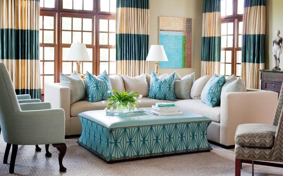 Если помещение гостиной достаточно просторное — не исключено использовать насыщенный глубокий синий цвет в занавесках. Для компактных комнат — отличный выбор светлая бирюза, либо шторы в сине-белую полоску. Выбор цветного варианта для штор полностью заложен в оформлении комнаты. Допустимо лишь дополнение цветом, без резкой фотопечати и излишне нарочитой драпировки.