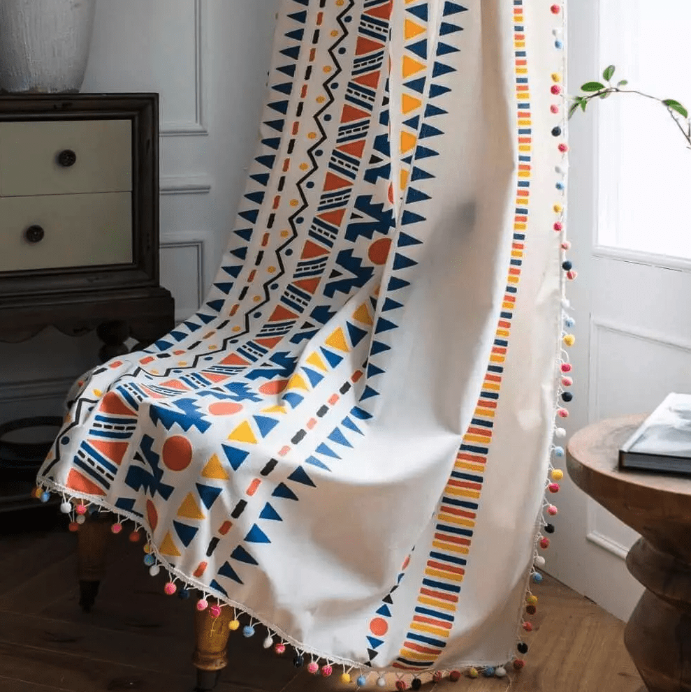 В этом стиле чаще всего применяют белые или синие занавески с рисунками, геометрическими принтами или без. Также отдельного внимания заслуживают натуральные изделия из бамбука, которые отлично сочетаются с дизайном помещения и поддерживают общую стилистику.