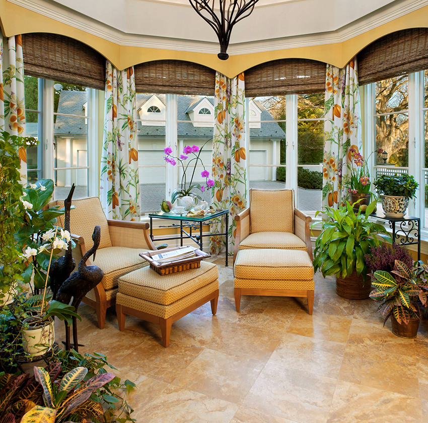 - Веранда. Легкие шторы из полупрозрачной ткани или сетки создадут романтическую атмосферу и станут прекрасным дополнением веранды.