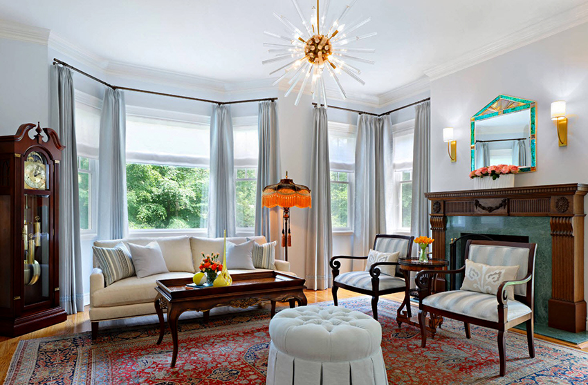Советы дизайнеров: фото штор для зала с эркерными окнами