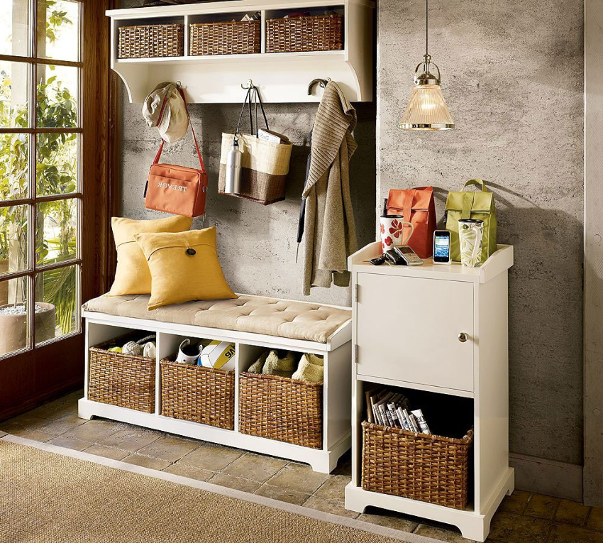 Поскольку свободного пространства в прихожей практически нет, каждый элемент должен быть многофункциональным. Поэтому малогабаритная тумбочка для ключей и сумок в то же время может использоваться для сортировки почты, а небольшая тумбочка для хранения обуви может служить стулом для комфортного обувания или снятия обуви.