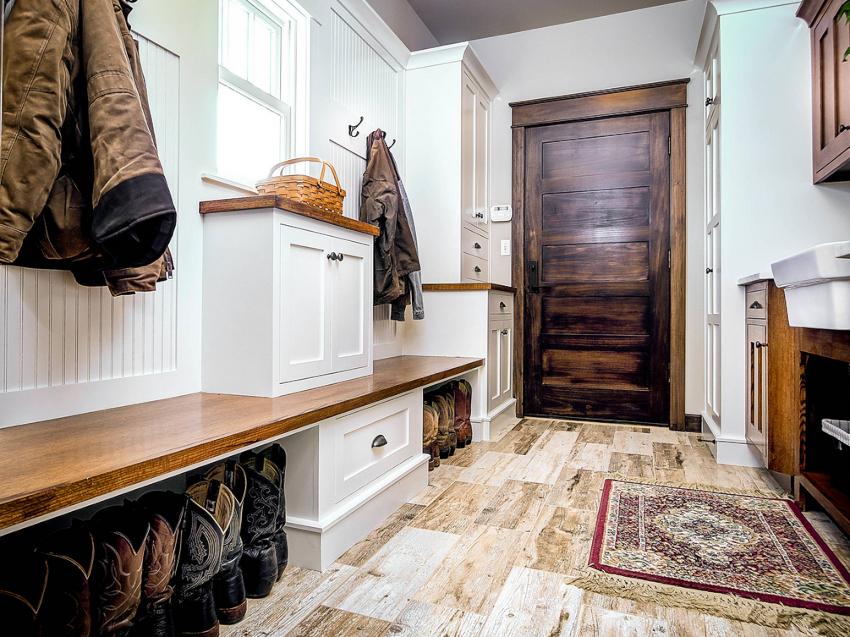 Керамогранит — прекрасный выбор для отделки входной зоны. Он не впитывает влагу, износоустойчив, и его легко убирать. Если позволяет площадь, плитку можно комбинировать с ламинатом или паркетом