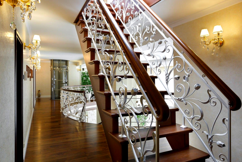 Кованые перила с деревянными поручнями являются наиболее востребованными ограждениями для лестниц