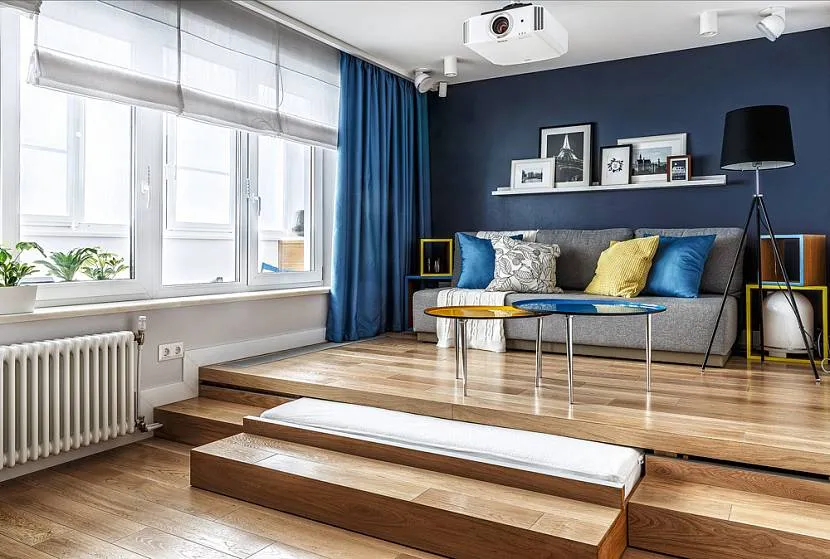 Хороший способ разделить помещение – устроить подиум для одной из зон, если потолки достаточно высокие.