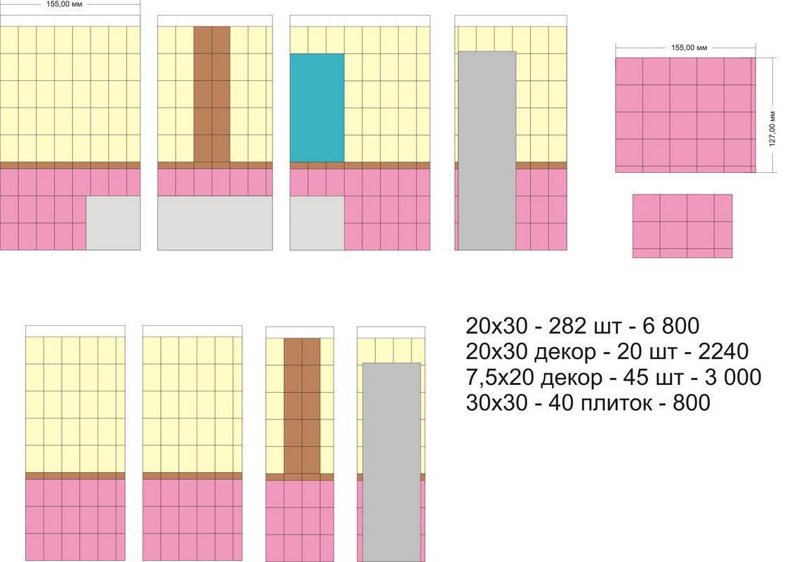 Подобным образом можно рассчитать количество керамики для любых помещений и стен. Делайте это любым удобным способом. Для исключения ошибки профессионалы советуют сделать раскладку на бумаге и сверяться по ней при расчётах. Обязательно укажите припуски и толщину швов. И не забудьте про рекомендуемый запас 10 %.