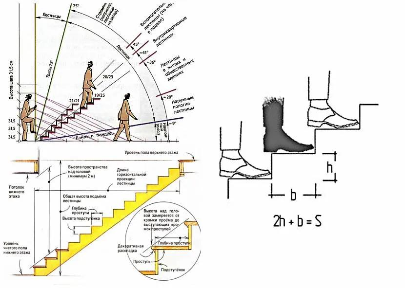 Научно подтверждено, что энергозатраты на преодоление горизонтальной дистанции вдове меньше, чем затраты энергии на подъем по наклонной поверхности. Благодаря этому практически установлена формула лестницы, которая будет максимально комфортной и безопасной для эксплуатации: размер проступи и удвоенная высота подступенка в сумме должны давать средний шаг взрослого человека. Проекция человеческого шага считается равной в среднем 600 — 640 мм. Тогда, обозначив высоту подступенка буквой a, ширину проступи – буквой б, формула будет иметь вид: 2а + б = 600-640 (мм).